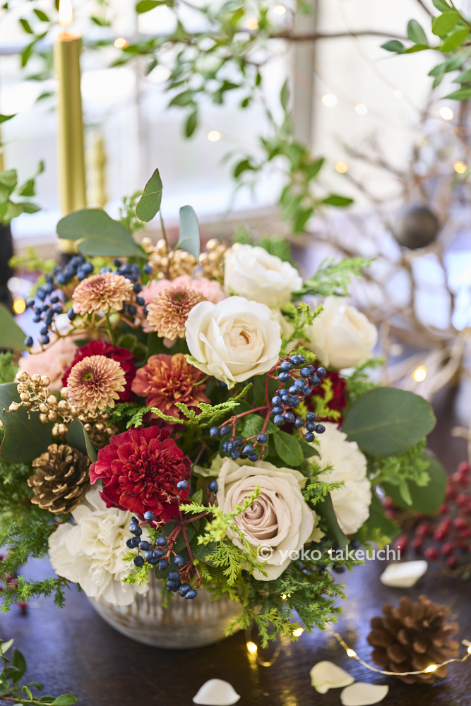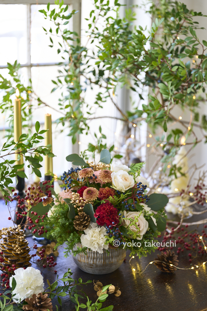 クリスマスというとナチュラルな雰囲気、グリーンや赤や木が多いイメージが一般的ですが、小物セレクトを陶器やまた花のセレクトも赤オンリーではなく白っぽい